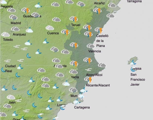 Cielo muy nuboso, con chubascos localmente fuertes o muy fuertes, persistentes y acompañados de tormenta en las provincias de Valencia y Castellón, cesando a partir de mediodía en Valencia y por la tarde en Castellón. Temperaturas mínimas en descenso, ligero en el interior y Castellón; máximas en ascenso ligero, más marcado en el interior de Valencia. Viento de componente este moderado en el litoral, rolando a oeste flojo al final de la jornada; en el resto, flojo del norte y noreste, cambiando a variable con predominio de la componente oeste.