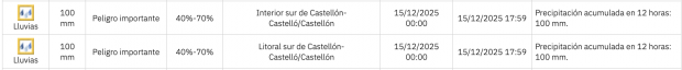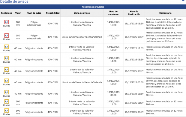 Valencia y Castellón siguen en alerta roja por «chubascos localmente fuertes o muy fuertes, persistentes y acompañados de tormenta». La AEMET avisa de peligro extraordinario de inundaciones por precipitaciones acumuladas que pueden ser de hasta 250 mm en la zona cero de la DANA. En toda la Comunidad Valenciana se ha decretado la alerta roja, naranja y amarilla para este lunes 15 de diciembre. En la provincia de Valencia se ha suspendido la actividad en colegios y universidades.