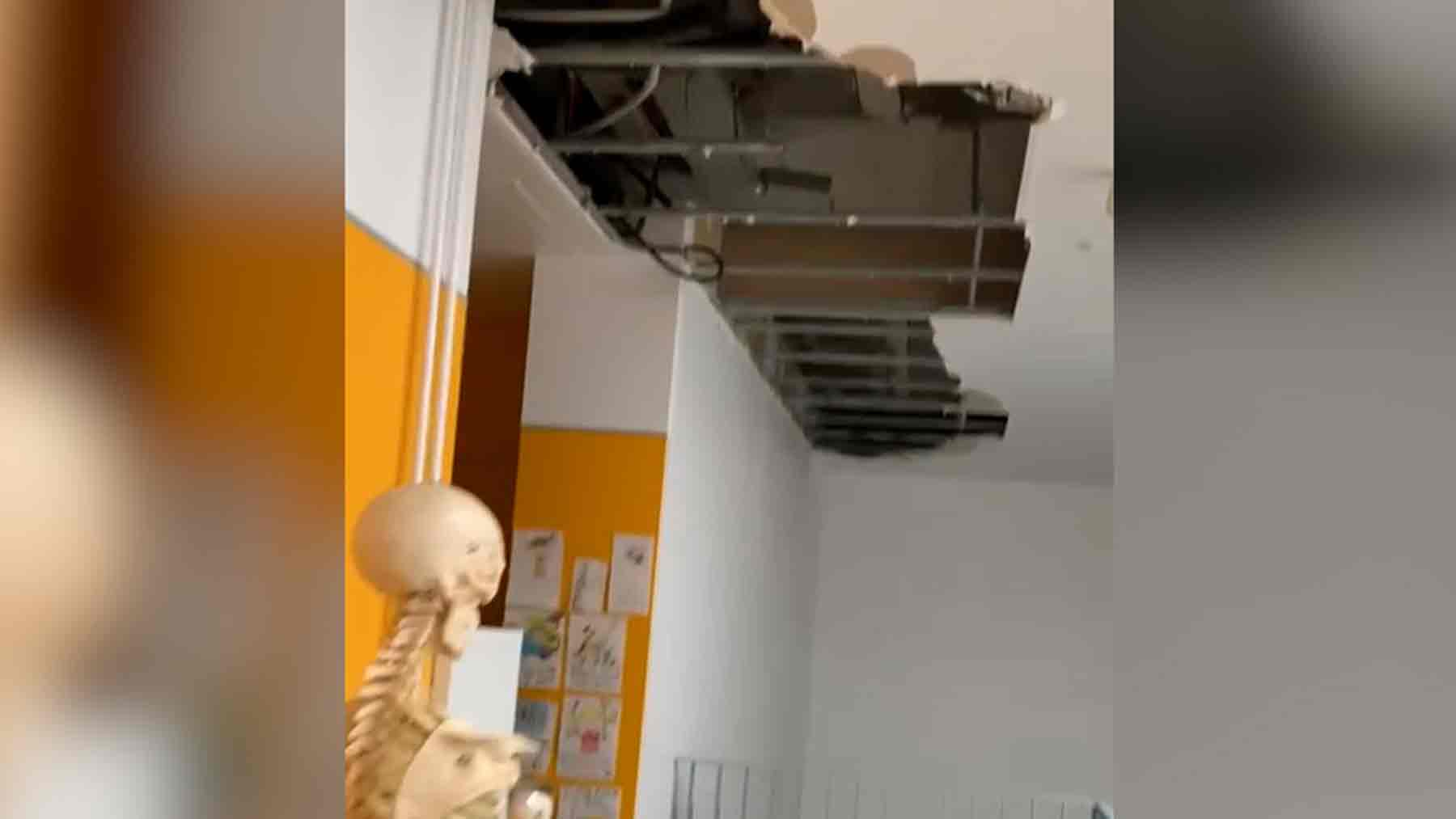 Como se puede ver en el vídeo, una fila de cubos escalonados recogen el agua que se filtra por el techo de la escalera que da acceso a la planta baja. Cuando la cámara enfoca a ese techo, causa impacto observar las entrañas de la cubierta: el falso techo se ha desprendido. Pero la cámara continúa su recorrido hacia las plantas superiores. Y se observa un agujero aun más grande en el techo del citado centro educativo. Todo ello, mientras se escucha de fondo el constante sonido del agua al golpear contra el suelo y el fondo de los cubos.