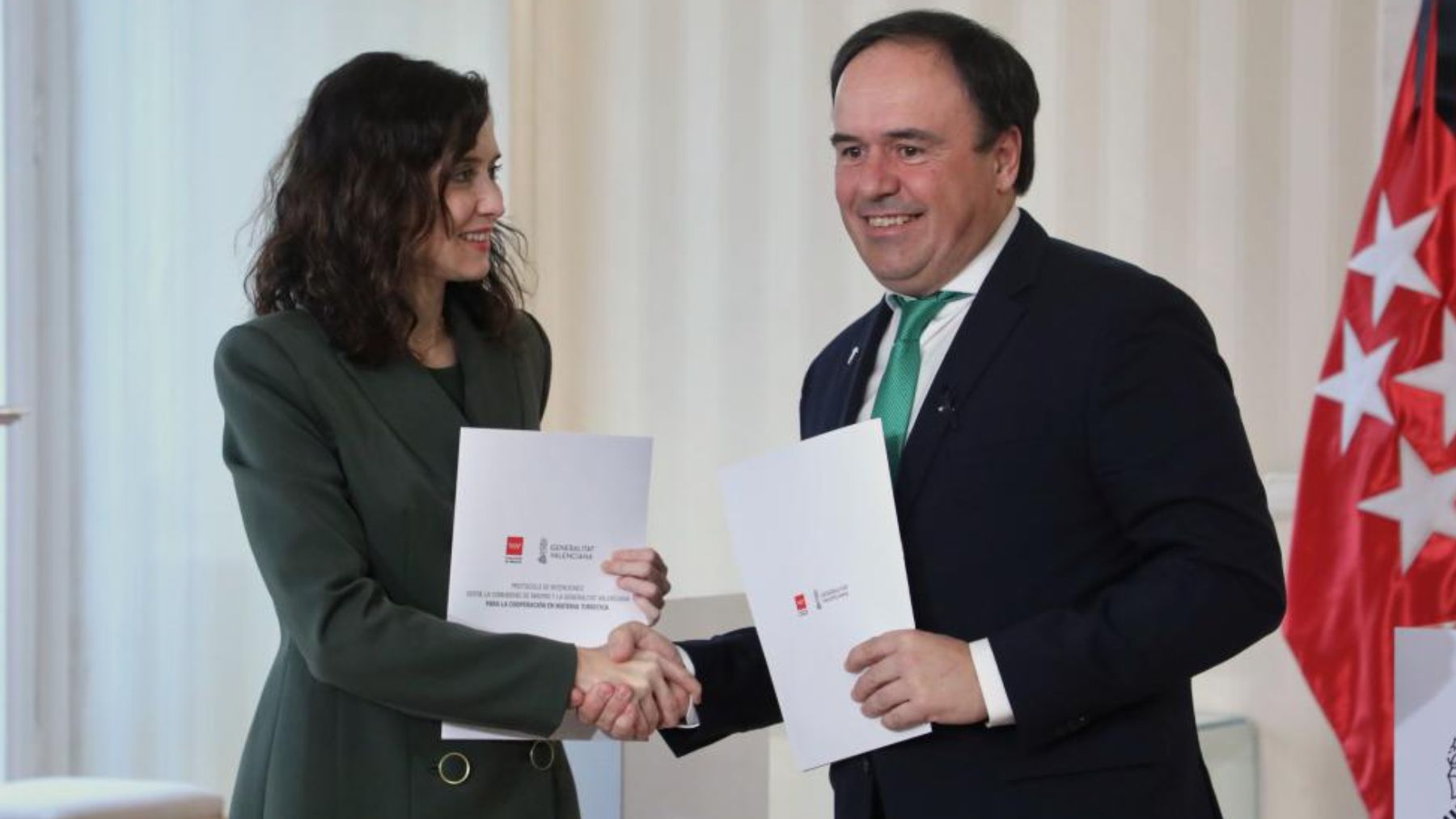 La presidenta de la Comunidad de Madrid, Isabel Díaz Ayuso, y el presidente de la Generalitat Valenciana, Juan Francisco Pérez Llorca, han firmado este miércoles un protocolo de cooperación de ambas Comunidades en innovación, desarrollo de proyectos y formación en materia turística. Tanto la Comunidad de Madrid como la Comunidad Valenciana apuestan, con este acuerdo, por un eje de inteligencia turística que permita conocer mejor el perfil de los turistas que visitan ambos territorios. El acuerdo se ha firmado en la Real Casa de Correos, sede de la Presidencia de la Comunidad de Madrid. Si bien se encuadra dentro del marco de la Feria Internacional del Turismo (FITUR), que estos días se celebra, también, en Madrid, tal como ha destacado la propia Generalitat Valenciana.