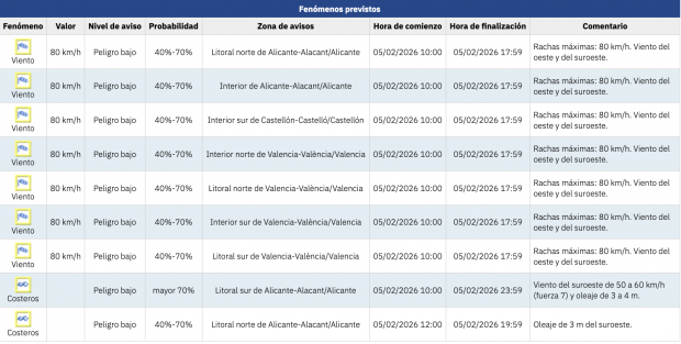 Para este miércoles 5 de febrero se han activado dos avisos por fenómenos costeros entre las 10.00 horas y las 23.59 horas en el litoral sur de la provincia de Alicante y entre las 12.00 horas y las 19.59 horas en el litoral norte de Alicante, donde se espera «oleaje de 3 metros del suroeste».