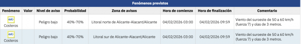 La borrasca Leonardo pondrá en alerta a la provincia de Alicante este miércoles 4 de febrero por viento y lluvias. La AEMET ha confirmado la alerta amarilla desde las 03.00 horas de esta madrugada y hasta las 10.00 horas en el litoral norte y sur del sur de la Comunidad Valenciana por fenómenos costeros. Durante estas horas y puede que a lo largo de la mañana, se espera «viento del suroeste de 50 a 60 km/h (fuerza 7) y olas de tres metros».