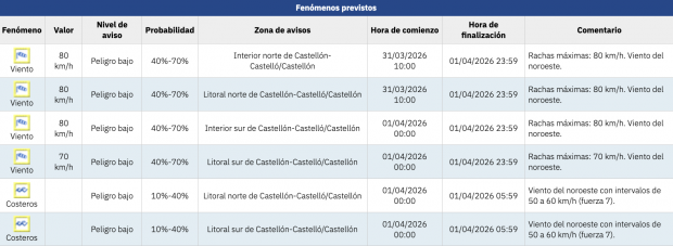 La AEMET ha vuelto a poner en alerta amarilla a la Comunidad Valenciana en este 1 de abril, día de Miércoles Santo. La Agencia Estatal de Meteorología ha activado un aviso por «rachas muy fuertes del noroeste en Castellón e interior norte de Valencia». Estas alertas han sido activadas durante todo el día en toda la provincia de Castellón, donde se esperan rachas máximas de 80 km/h durante este miércoles 1 de abril.