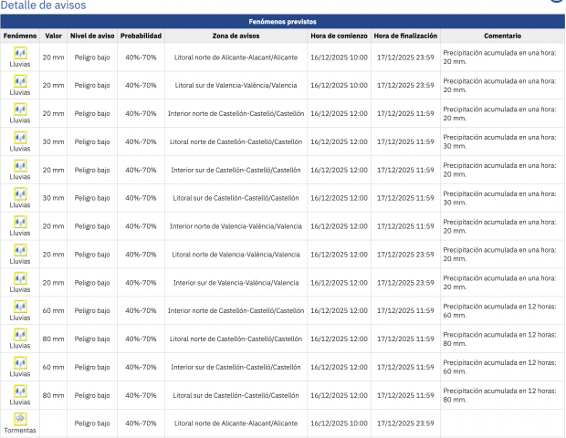 Las lluvias también afectarán a la provincia de Valencia, donde se espera una precipitación acumulada en una hora de 20 mm y de 60 mm en el litoral sur. En el interior sur, la alerta amarilla ha sido declarada hasta las 23.59 horas de este miércoles 17 de diciembre. «Cielo nuboso, con chubascos débiles a moderados, que pueden ir acompañados de tormenta y ser puntualmente fuertes», dice la AEMET.