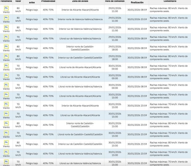 «Rachas muy fuertes de viento del oeste, menos probables en el litoral de Castellón», avisa la AEMET sobre la alerta amarilla en la Comunidad Valenciana para este viernes 30 de enero. La AEMET ha activado un aviso para Valencia, Alicante y el sur de Castellón para las primeras horas de la mañana con rachas de viento de hasta 80 km/h y, posteriormente, se ha activado otra que irá desde las 15.00 horas hasta las 23.59 horas con rachas de entre 70 km/h y 80 km/h.