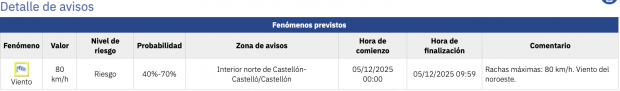 La AEMET también ha decretado el nivel de alerta amarilla en Castellón por «posibles rachas muy fuertes de viento del oeste a primeras horas en el interior». Concretamente, el aviso se ha activado entre las 00.00 horas y las 09.50 horas en el interior norte de la provincia de Castellón por rachas máximas de hasta 80 km/h.