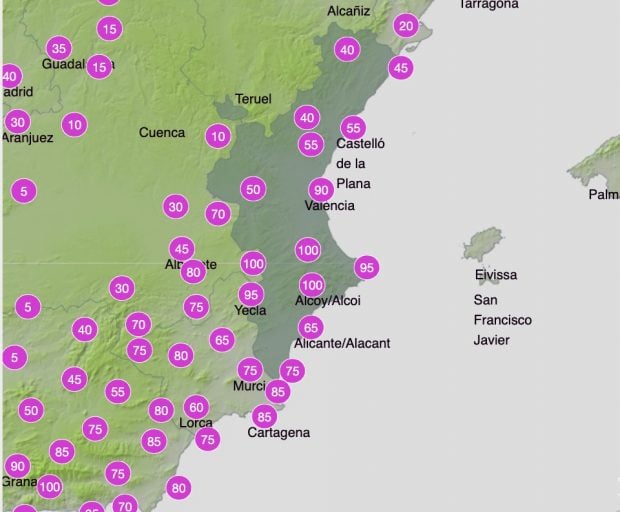 «Intervalos nubosos, con probables chubascos ocasionalmente acompañados de tormenta en Valencia y Alicante, y que no se descartan en Castellón», avisa la AEMET sobre las lluvias que aparecerán durante este viernes 24 de abril en toda la Comunidad Valenciana. La probabilidad será del 100% en algunas zonas del interior primera hora de la mañana.