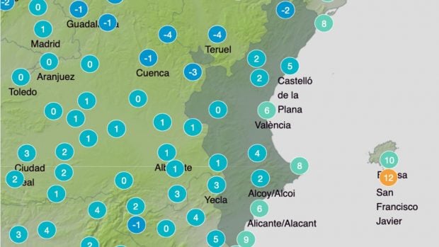 En Valencia las temperaturas también se irán por debajo de los 0 ºC en Requena, donde los termómetros bajarán hasta los -1 ºC en Requena. En Valencia las mínimas caerán hasta los 6 ºC. La AEMET también ha avisado de heladas y fuertes rachas de viento en el interior. La probabilidad de que nieve en esta zona es de l5% entre las 18.00 horas y las 00.00 horas.