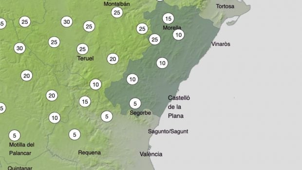 El punto más frío de la Comunidad Valenciana estará en la provincia de Castellón, donde en las horas más frías de la noche se llegará a los -2 ºC en Morella, donde la AEMET ha situado la probabilidad de nieve en torno al 25%. En la capital se registrarán temperaturas de 5 ºC con una máxima de 14 ºC durante el día. «Cielo poco nuboso o despejado, aumentando a intervalos nubosos al final del día. Temperaturas en descenso. Heladas débiles en el interior. Viento moderado de componente oeste, sin descartar rachas muy fuertes en puntos expuestos del interior», dice la AEMET sobre el tiempo en la provincia de Castellón.
