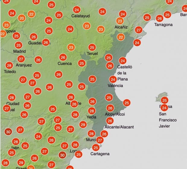 «Temperaturas mínimas sin cambios y máximas en ascenso», ha avisado la AEMET sobre la predicción del tiempo en la Comunidad Valenciana para este viernes 3 de octubre. Las temperaturas también subirán en la provincia de Valencia, donde se llegará a los 28 ºC en Onteniente, a los 27 ºC en Requena y en Valencia se alcanzarán los 25 ºC. La misma temperatura máxima tocarán los termómetros en Castellón, donde las mínimas durante la noche bajarán a los 16 ºC. Incluso durante este viernes 3 de octubre habrá un aumento de las temperaturas en Morella, donde se llegará a los 24 ºC con una mínima de 11 ºC durante la noche.