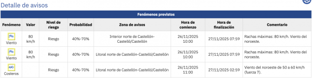 El viento está siendo el gran protagonista en esta última semana de noviembre en la Comunidad Valenciana. Tras la alerta naranja decretada el miércoles, la AEMET ha informado de una nueva alerta amarilla en el litoral y el interior norte de la provincia de Castellón. Durante la primera hora de la mañana se esperan rachas de viento de hasta 80 km/h en esta zona de la Comunidad Valenciana.