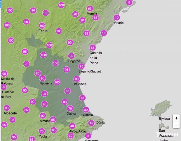 De primeras, la AEMET informa para este viernes 15 de enero de la «probabilidad de precipitaciones débiles» con ascenso de las mínimas y máximas en descenso. Durante el día, la posibilidad de precipitación llegará a ser de un 100% en el interior de las provincias de Valencia y Castellón. En la capital de la Comunidad Valenciana este porcentaje bajará al 90%. «Cielo nuboso con probabilidad de precipitaciones débiles, más baja en el litoral», dice la AEMET sobre el tiempo en Valencia.
