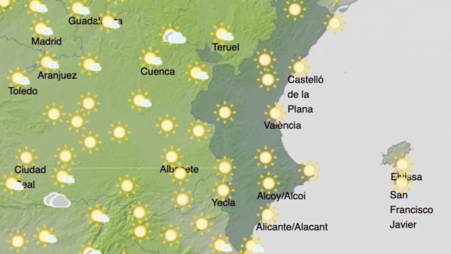 El punto más caliente de la Comunidad Valenciana será la localidad de Orihuela, en Alicante, donde se llegará a los 23 ºC durante las primeras horas del día. En Elche la máxima será de 22 ºC y en la capital de la Costa Blanca los termómetros se quedarán en 19 ºC. La mínima de la zona estará en Alcoy, donde se bajará hasta los 6 ºC. Las temperaturas también serán altas en la provincia de Valencia, donde se llegará a 22 ºC. La mínima será de 9 ºC en la capital y los termómetros bajarán hasta los 5 ºC en el interior, concretamente en Requena.