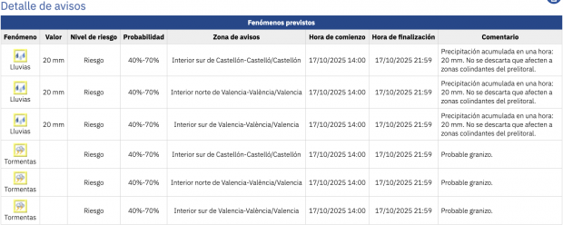 La AEMET también ha confirmado que estas lluvias fuertes «no se descarta que afecten a zonas colindantes del prelitoral». La alerta amarilla también está activada por el riesgo de tormentas con la posibilidad de que haya granizo en el interior de la provincia de Valencia y el interior sur de Castellón.