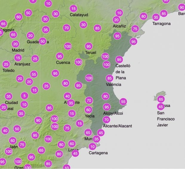 Además de esta alerta amarilla, tampoco se descartan las lluvias en la provincia de Alicante, llegando el porcentaje a un 95% en Alcoy y un 70% en la capital de la Costa Blanca. En el interior de las provincias de Valencia y Castellón hay una probabilidad del 100% de que haya lluvias durante la jornada de este viernes 17 de octubre.