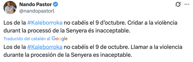 La reacción del PP no se ha hecho esperar. El diputado autonómico alcoyano Fernando Pastor ha respondido a la publicación de Vicent Mascarell: «Los de la kale borroka no cabéis el 9 d’Octubre. Llamar a la violencia durante la procesión de la señera es inaceptable».