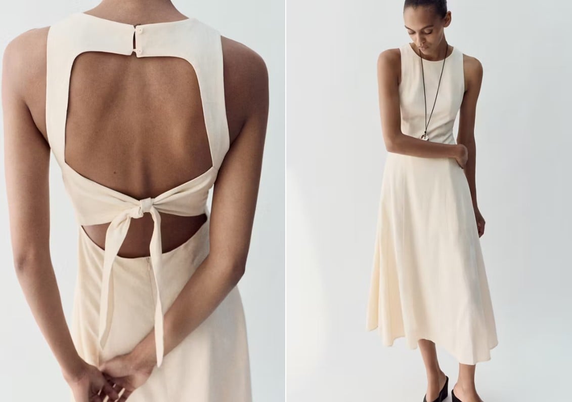 Un vestido de esta colección puede ser tuyo por menos de 50 euros. Antes de que se agote puedes hacerte con una de esas prendas que impresiona. Con una espalda al aire y un marco en blanco para poder darle el estilo en complementos dorados y lujosos ideales para un evento o con una simple blazer para una reunión de trabajo.