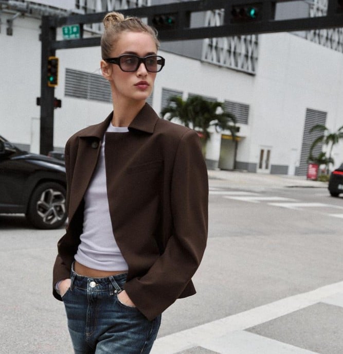 La blazer completa el look con un toque sofisticado y estructurado, elevando el conjunto.