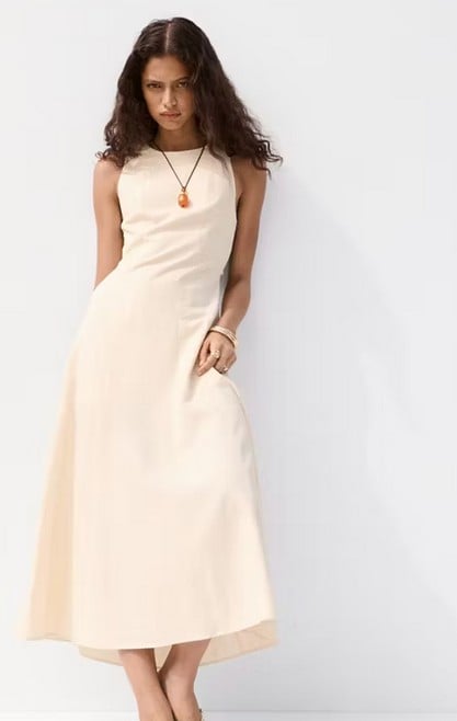 El lino vuelve a consolidarse como uno de los tejidos estrella, especialmente en propuestas de corte más holgado. Este vestido largo en color crudo que cuesta 49,99 euros, presenta un diseño evasé que favorece el movimiento y aporta frescura. El cuello halter y el cierre con lazo en la espalda añaden un toque delicado y femenino.