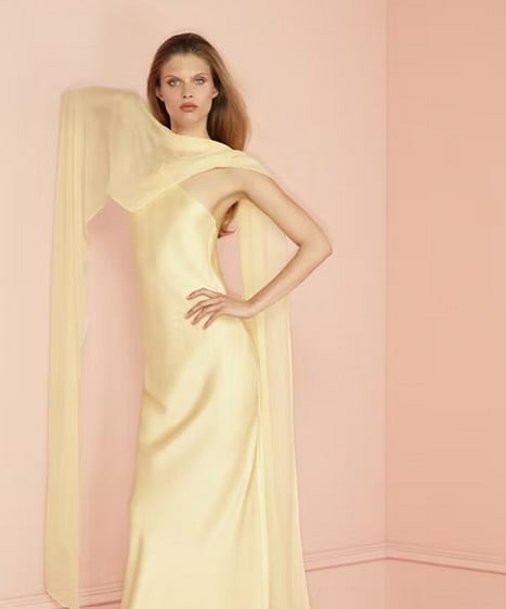 Dentro de la colección Capsule, este vestido representa la opción más sofisticada y también de mayor coste, a 200 euros. Su tejido satinado y fluido, disponible en tonos como amarillo pastel, marrón y verde, crea un efecto elegante que se adapta a ocasiones especiales. El diseño entallado se complementa con un cuello halter y una capa desmontable que aporta volumen y versatilidad.