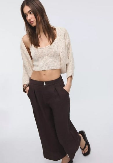 El pantalón culotte rústico apuesta por una silueta amplia, con tiro alto y pernera recta. Este tipo de corte se ha consolidado como una opción cómoda que, además, estiliza sin necesidad de prendas ajustadas.