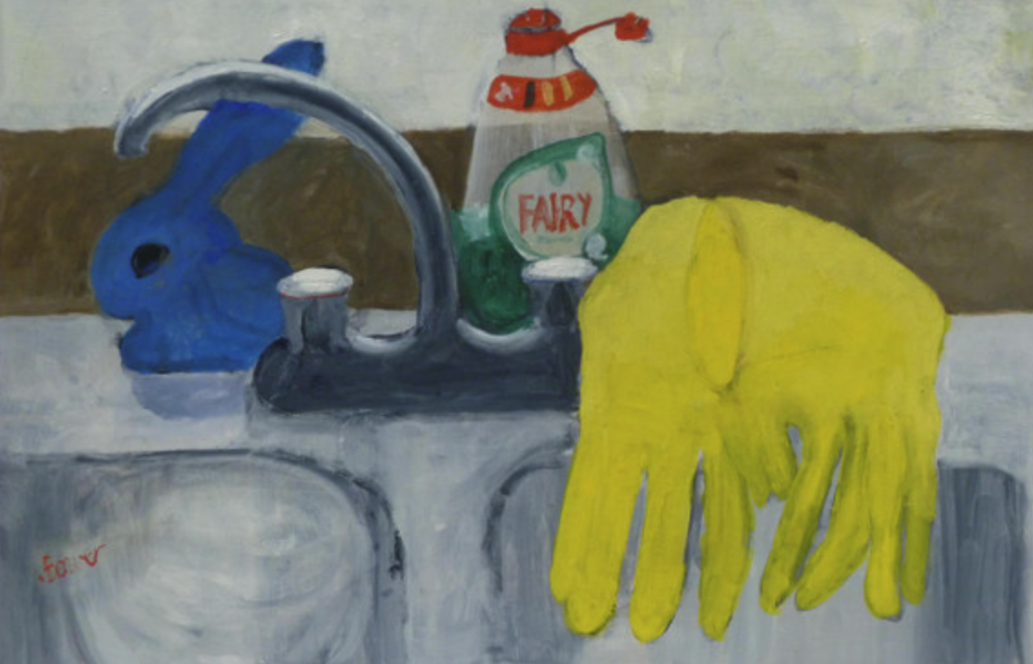Susan Bower retrata el fregadero de acero de su casa de Yorkshire (Inglaterra), donde no faltan los guantes amarillos de lavar platos, la botella de Fairy a medio usar y el conejito de cerámica de la marca Sylvac, donde guardamos el estropajo al terminar. Y Jane Dunne Borresen retrata los placeres sencillos de una taza de té con tostadas de mantequilla y el periódico del día o una taza de porcelana con chocolate caliente y una berlina en el borde del plato.