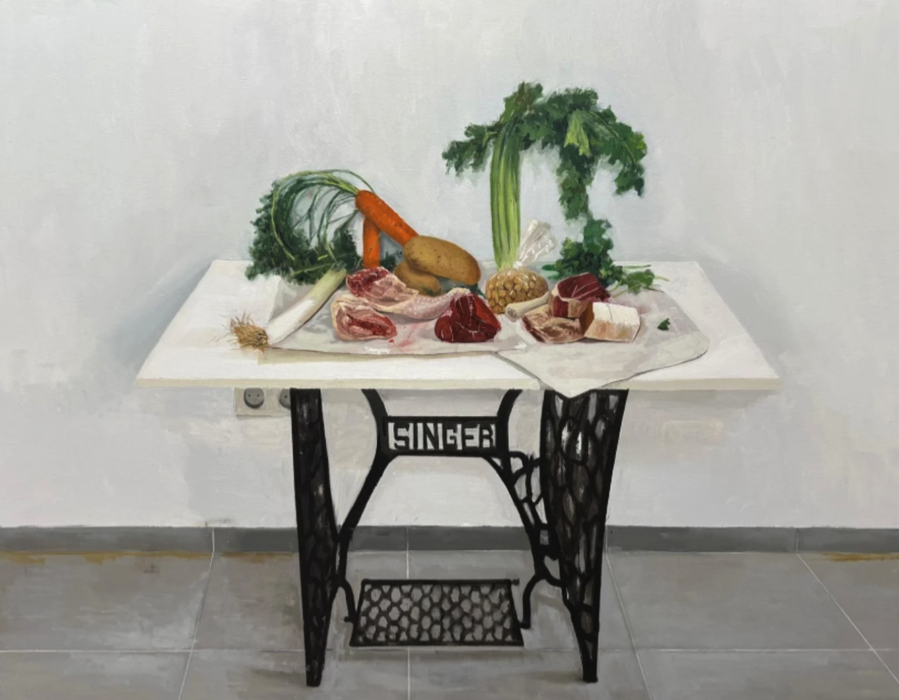 Igual que Quintanilla, también Baena tiene una mesa de Singer entre sus obras. En esta ocasión, en lugar de acoger labores de costura, acoge un bodegón de puchero. «Tiene todos los productos e ingredientes esparcidos por el pie de la máquina, preparados para ser echados a la olla. Son recuerdos que todos tenemos de infancia, ahora yo no hago pucheros con los tiempos que llevo; pero todo eso lo hemos visto en casa, como el cuarto de lavadora o el cuarto de baño como el de Antonio López, que se ha convertido en una de sus obras más destacadas».