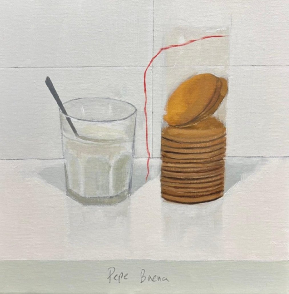 «El bodegón es un género muy apegado a la tradición española y me divierte mucho que los contemporáneos sigan pintando bodegones. Creo que es la tradición en el S. XXI, con sus guiños de renovación. En el caso de Pepe Baena, los Cola-Caos con galletas son los que toman sus hijos, lo que pasa es que son Dinosaurios, la versión moderna de nuestras galletas María. Creo que si soy abuela, les daré a mis nietos ese mismo desayunó que tomé yo y que tomó mi hijo», advierte.