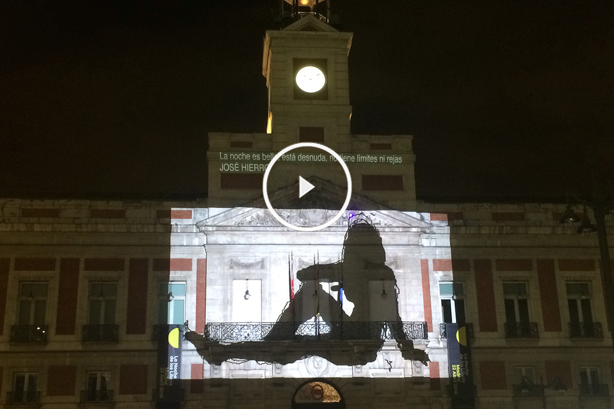 La transitada Puerta del Sol se convirtió en un espacio para la poesía en el que cientos de madrileños acudieron para participar de este homenaje al arte hecho con palabras. Para ello en la fachada de la Real Casa de Correos se proyectaron versos firmados por poetas de todos los tiempos como Mario Benedetti, Lope de Vega o Blanca Andreu, entre otros muchos.