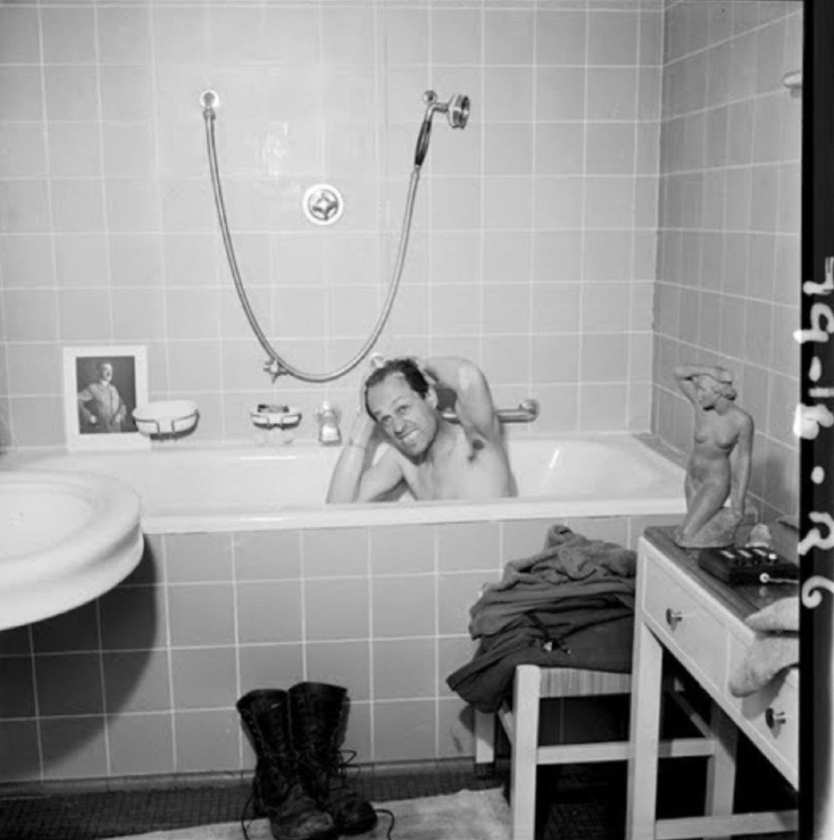 Tras salir de los campos el 30 de abril de 1945, los amigos y compañeros Scherman y Lee Miller se trasladan a Munich y entran al apartamento privado de Adolf Hitler. El Führer y Eva Braun, su amante, ya están muertos. Allí, con las botas aún pesadas por el barro de los campos, la fotógrafa comprueba que la ducha funciona y tiene agua corriente. Se desnuda, se sienta y se da un baño. Scherman dispara a su compañera, dejando una de las imágenes más icónicas de la Segunda Guerra Mundial y, por supuesto, también de toda su existencia. Lee Miller se limpió la suciedad de aquellos campos recién fotografiados en el baño de su verdugo. Onírico.
