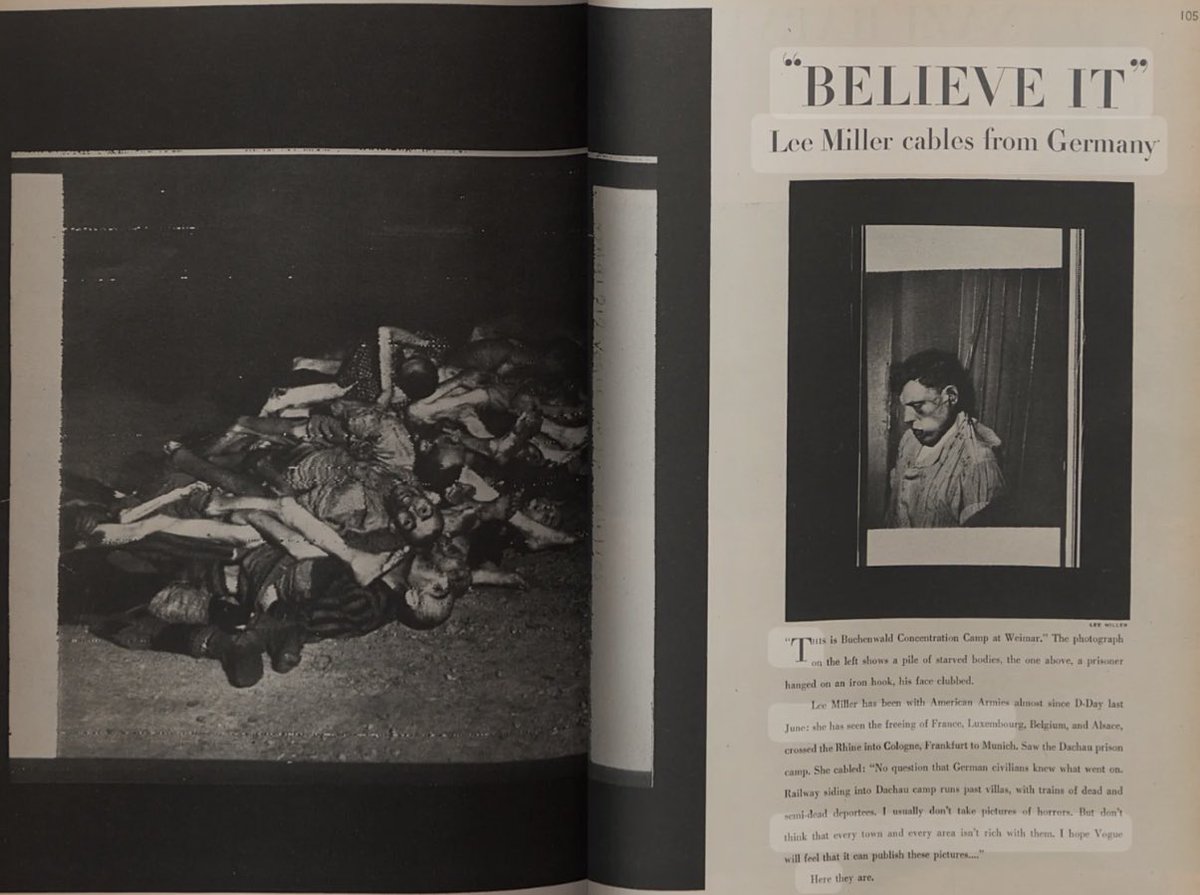 La cobertura de la Segunda Guerra Mundial fue un reto para Lee Miller. Puso a prueba su capacidad de adaptación, su fuerza y su valentía. Ella, maniquí de moda en Vogue descubierta por el propio Conde Nast, portada de la más prestigiosa revista femenina con sólo 17 años y caída en desgracia por ser imagen de un spot de compresas en la puritana EEUU, fue testigo de la liberación de los campos de concentración Dachau y Buchenwald, observó en primera persona (y los retrató) a cientos de prisioneros de mirada triste y vacía, cuerpos sin vida hacinados y cámaras de gas aún humeantes. Lee Miller, de hecho, contribuyó a que el genocidio nazi se viera en todo el mundo, incluso en una revista predominantemente femenina. El texto y las fotografías de Vogue llevaban un breve titular: «Believe It».