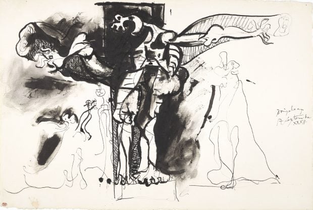 Pablo Picasso. Crucifixión. 17 de septiembre de1932 Tinta y grattages sobre papel. Musée national Picasso París. Dación Pablo Picasso, 1979. © Sucesión Pablo Picasso, VEGAP, Madrid, 2026
