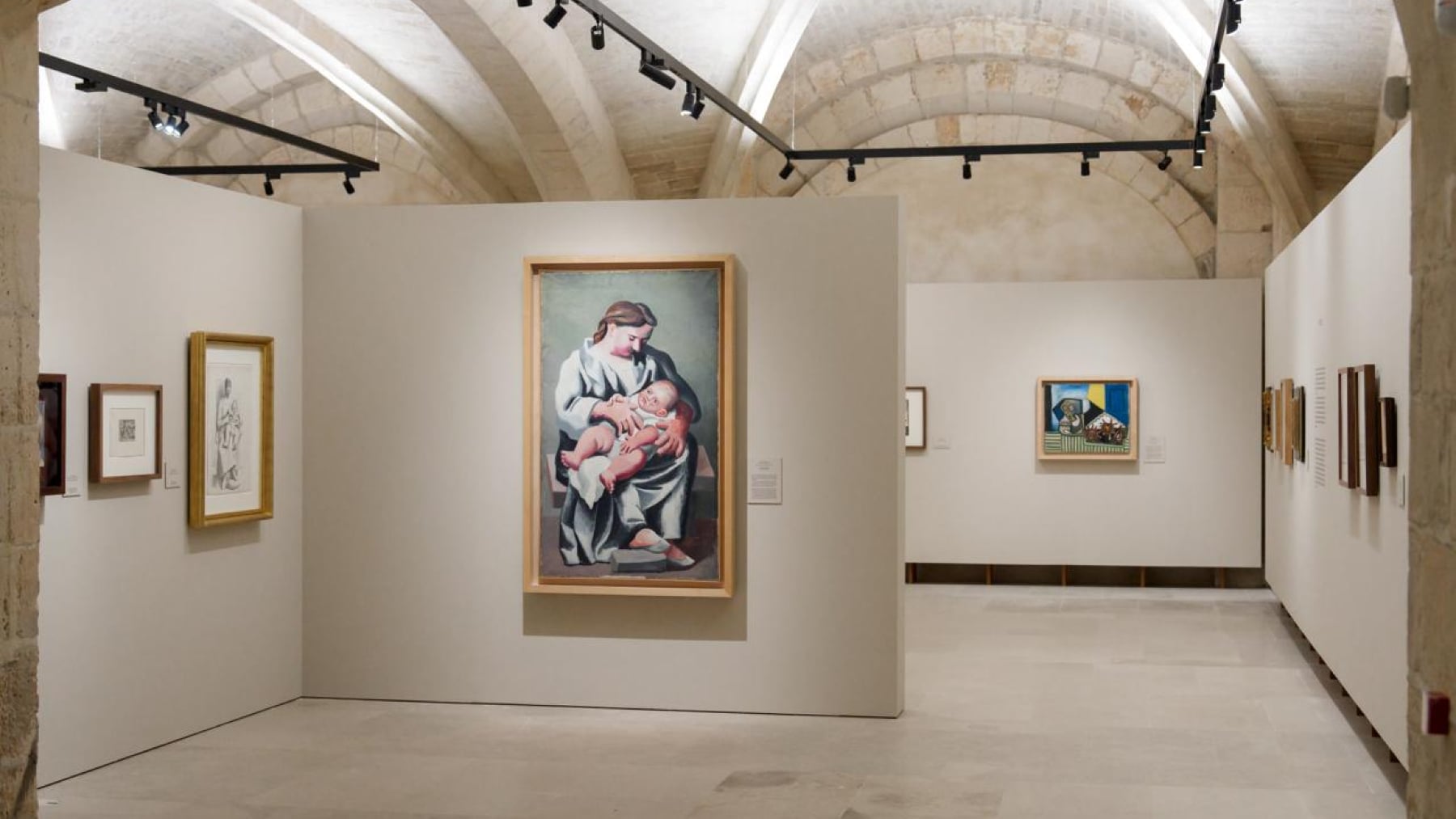 Una de las obras más antiguas, con fecha de 1897, es un Cristo Crucificado hecho al óleo y carboncillo sobre papel. Aunque el símbolo de la muestra, en esta ocasión, es una Maternidad, una obra de 1521 donde Picasso retrata a su hijo Paul en brazos de su madre, Olga Khokhlova. Según Alarcó, esta tierna escena fue pintada en un «momento de gran felicidad» del pintor «porque acaba de ser padre de su primer hijo». Defiende, además, que «Picasso siempre fue un gran defensor de la familia, parece raro decirlo con esa vida tan poco ortodoxa, pero él siempre fue una persona muy familiar, y en ese tiempo estaba feliz con Olga, su esposa, y con su hijo».