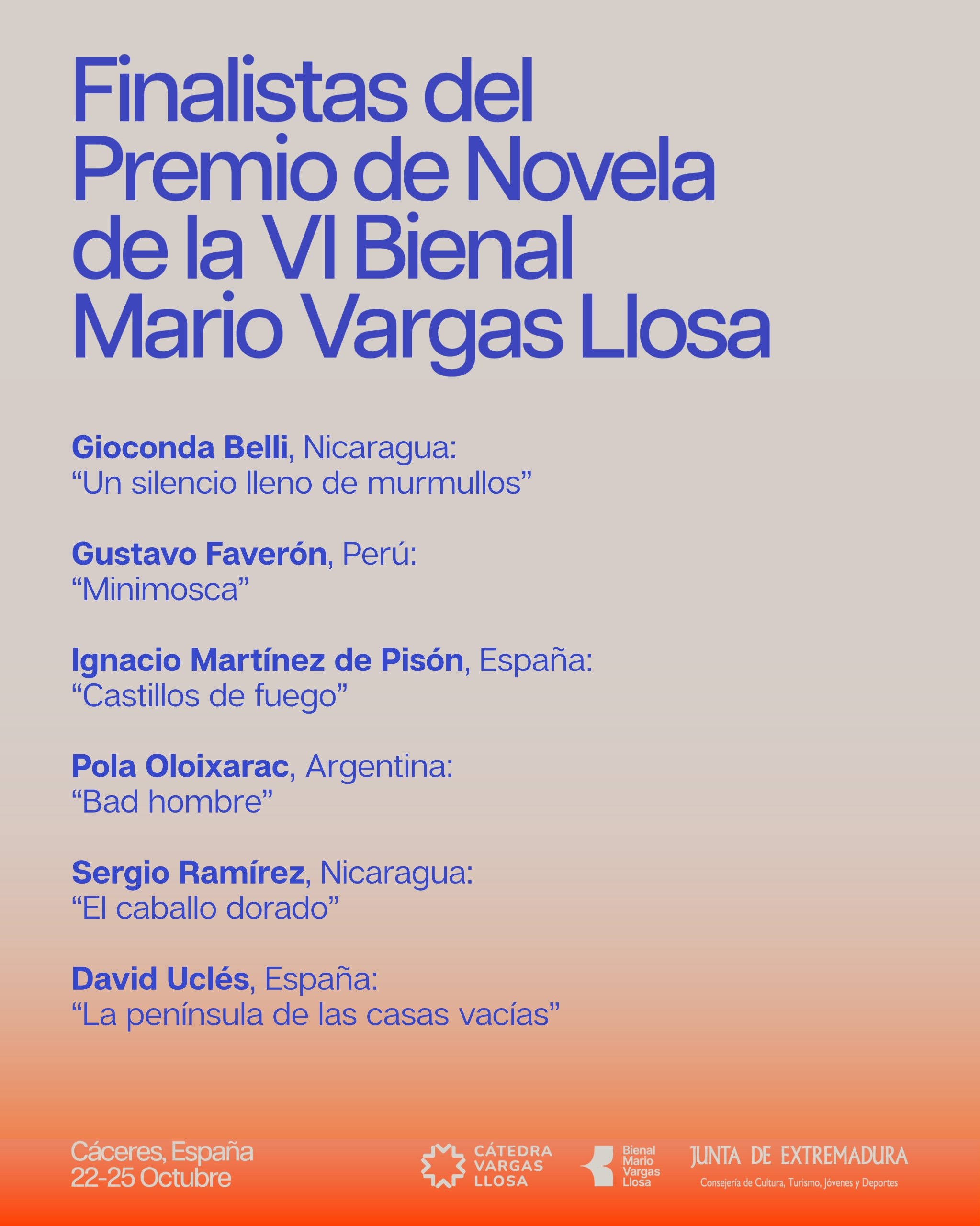 La Cátedra Vargas Llosa ha dado a conocer a los seis finalistas del Premio Bienal de Novela Mario Vargas Llosa, dotado con 100.000 dólares y considerado uno de los galardones más prestigiosos de la literatura en español. La VI Bienal se celebrará en Extremadura del 22 al 25 de octubre de 2025, con Cáceres como sede principal y actividades en Badajoz y Trujillo, con el impulso y apoyo económico de la Junta de Extremadura.