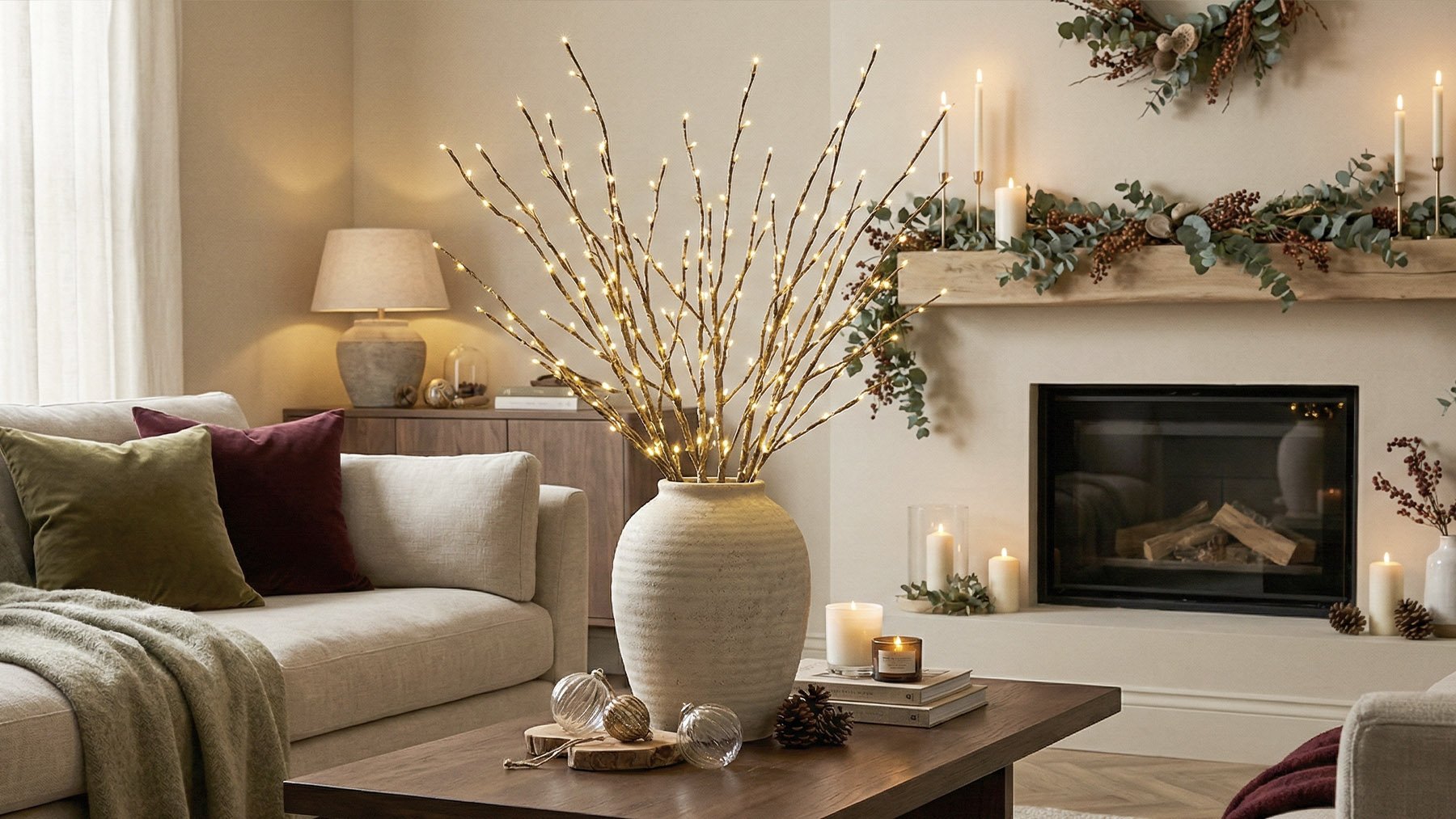 - Natural y escandinava: ramas con luces LED cálidas y jarrones neutros.