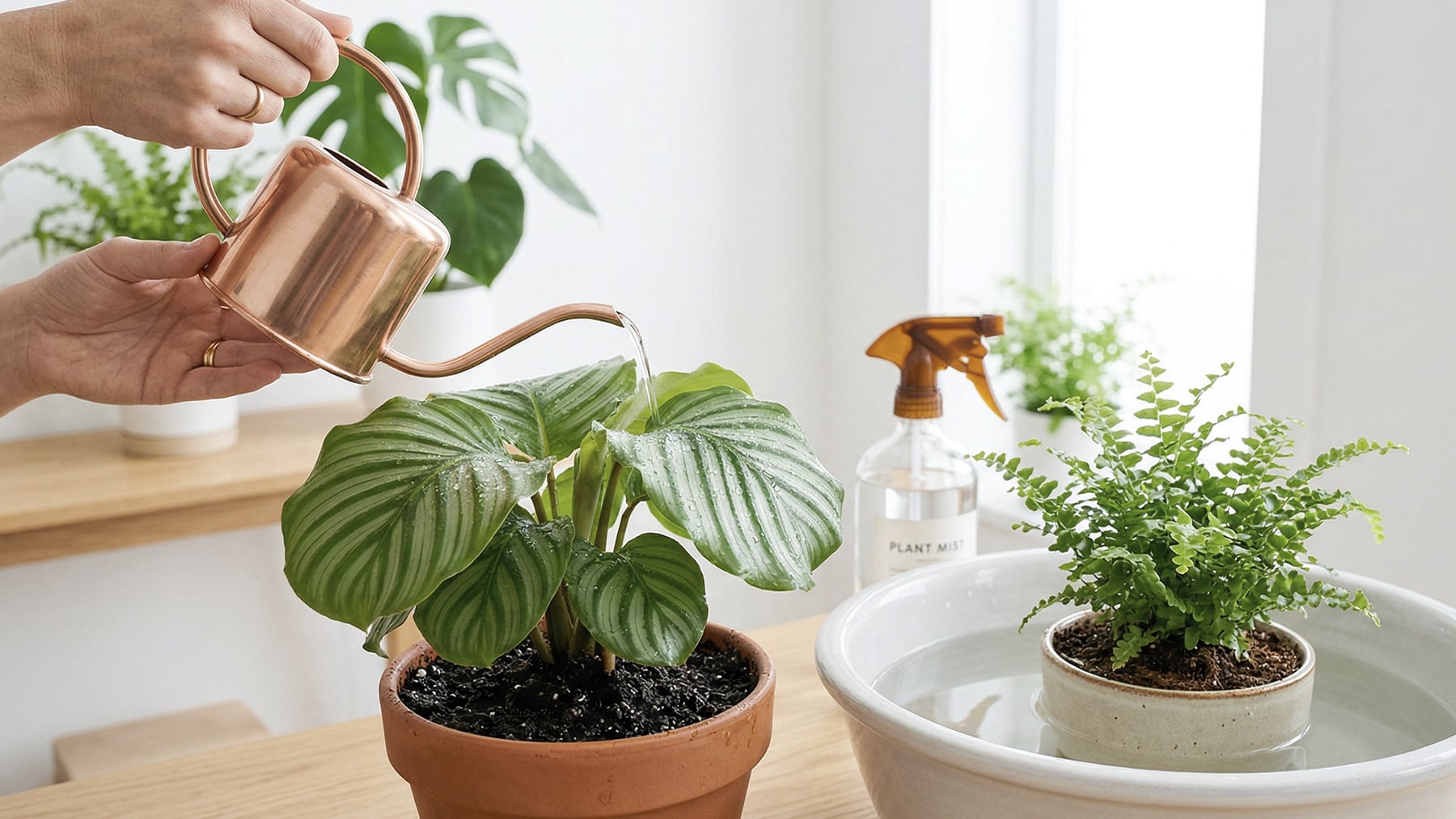 Las calateas son más exigentes con la humedad, pero también más sensibles al encharcamiento: si su sustrato retiene bien la humedad, regar desde arriba con cuidado o usar pulverizador puede ser suficiente.