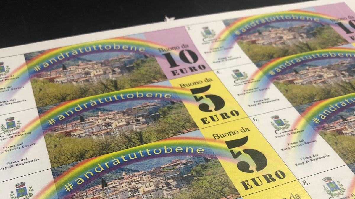 Con la idea de ayudar económicamente a todas las familias del municipio, Potenza ha decidido crear este ‘corona euro’. En estos billetes se ve el pueblo y un arcoíris que lo recorre, se puede leer #andratuttobene ‘Todo saldrá bien’. Con importes de 5 a 10 euros están destinadas a ir a aquellas casas que necesiten efectivo para su día a día. Un dinero imprescindible para volver a la normalidad y hacerse con aquello que necesiten.