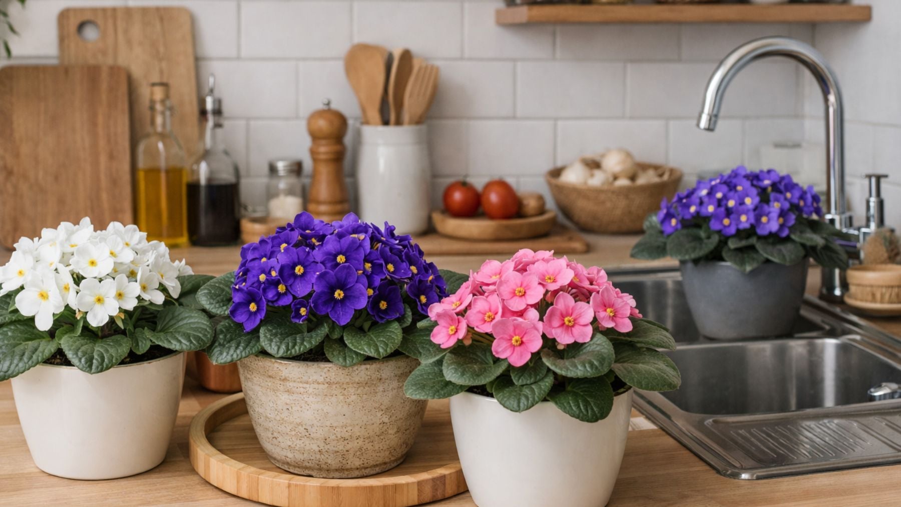 Aunque su nombre pueda inducir a pensar en un único color, la violeta africana ofrece flores blancas, azules, moradas y rosadas, tanto en tonos suaves como intensos. Esta variedad cromática facilita su integración en distintos estilos de cocina, desde ambientes clásicos hasta propuestas más contemporáneas.