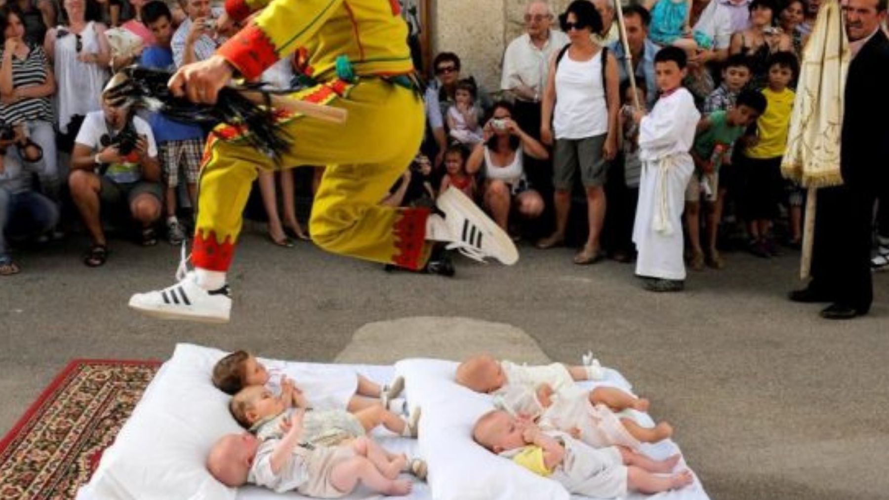 El festival comienza por la mañana, cuando los habitantes del pueblo se visten con sus trajes tradicionales y decoran las calles con colores vivos y flores. A lo largo del día, se realizan diversas actividades, como procesiones religiosas, música en vivo y danzas populares. Sin embargo, el momento culminante del evento llega cuando los hombres vestidos de demonios se preparan para saltar por encima de los bebés. Este momento, que generalmente se lleva a cabo por la tarde, es el más esperado del festival.