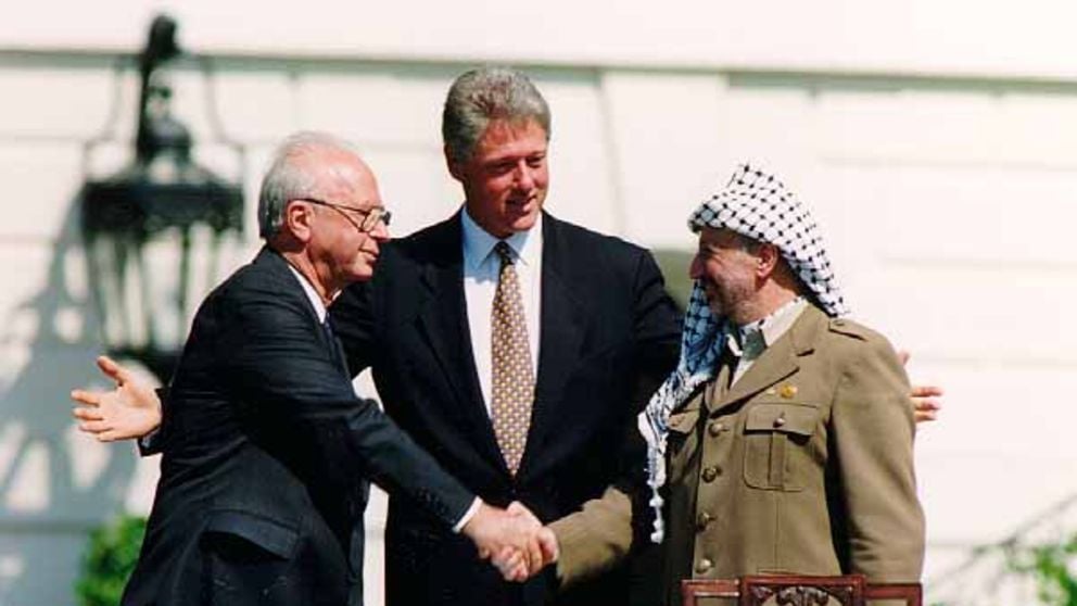 1993: en Washington DC (Estados Unidos) se firma la Declaración de Principios para la autonomía de Gaza y Jericó; los líderes Isaac Rabin y Yasir Arafat se dan la mano.