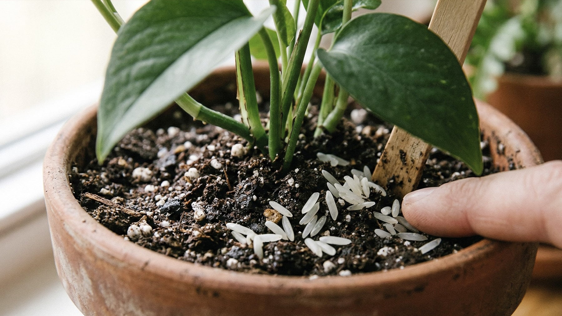 En el caso de plantas que van a ser trasplantadas, existe un método adicional: colocar el arroz en la base de la maceta nueva antes de trasplantar, mezclado con la tierra del fondo. Así actúa como abonado de fondo, mejorando también el drenaje radicular.