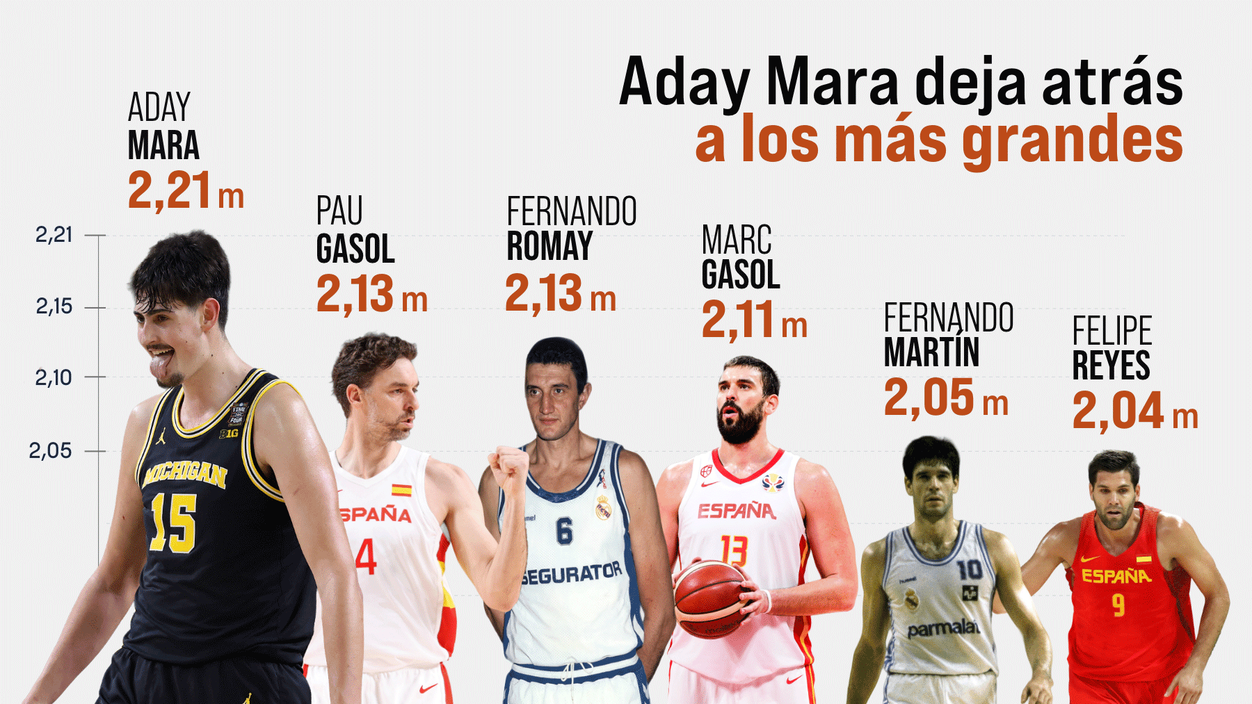 Sus 2,21 metros de altura le colocan incluso por encima de las leyendas más altas de la historia del baloncesto español. Aday Mara, llamado a liderar la que se espera que sea la segunda era dorada de la selección, es más alto que mitos como los hermanos Gasol, pues supera los 2,13 m de Pau y los 2,11 m de Marc.