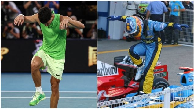Que Carlos Alcaraz es un fiel seguidor de Fernando Alonso no es una sorpresa para nadie. El tenista nunca ha ocultado que es fanático de la Fórmula 1 y hasta en algún partido de tenis cuando ha firmado la cámara tras un triunfo ha mandado un mensaje al asturiano. Tras vencer a Alexander Zverev en una épica semifinal del Open de Australia, el murciano se acordó nuevamente del asturiano imitando su celebración más icónica de los años de Renault.