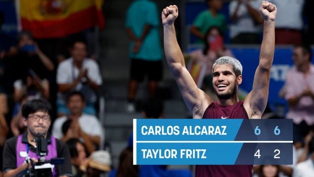 Alcaraz dio un nuevo recital, ofreció su particular exhibición ante un Fritz al que ganó hace tres semanas, en la final de Tokio. Tiene tomada la medida al californiano, resignado a su inferioridad, a pesar de aquel partido de la Laver Cup. No aflojó el número uno del mundo. No hay encuentros amistosos cuando salta a la pista con la raqueta en mano para Alcaraz que salió al duelo con el tobillo izquierdo aún protegido, vendado. Son las secuelas de ese choque de primera ronda ante Sebastián Báez en el evento japonés.