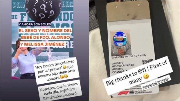 «Hoy hemos descubierto por la ‘prensa’ que nuestro hijo tiene otro nombre. Nosotros, que lo vemos cada día, seguimos llamándole Leonard», escribía Fernando Alonso en una de sus publicaciones compartiendo el vídeo en el que en el espacio televisivo aseguraban que el bebé se llamaba Fernando al igual que su padre. El piloto lo desmiente y acaba con cualquier otra especulación haciendo público el verdadero nombre del pequeño: Leonard. Además, en la siguiente storie compartía la primera acreditación de su hijo recién nacido para la Fórmula 1, obviamente sin enseñar el rostro del bebé.