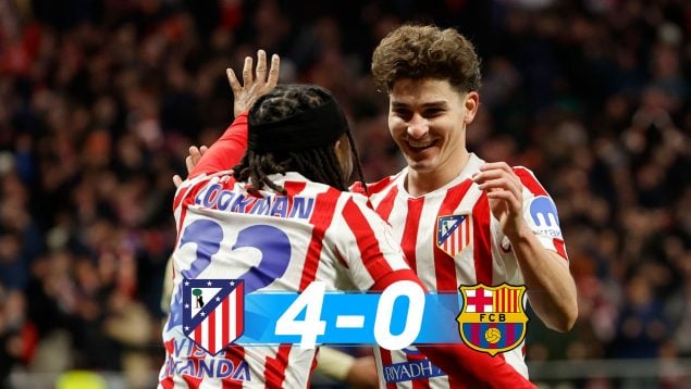 En ocasiones el fútbol va de golpes, tan simple como eso. Golpear hasta que el rival caiga y le duela tanto como para no levantarse. El Atlético asestó los puñetazos con guantes de 18 onzas a un Barcelona al que apenas dio tiempo para coger aire entre un y otro bofetón. Griezmann, Lookman -presente en todas las fotos- y Julián Álvarez -liberado de la sequía para la ocasión- se dieron el relevo para destrozar a los azulgranas y hacer sangre del tiro en el pie que se había pegado Joan García.