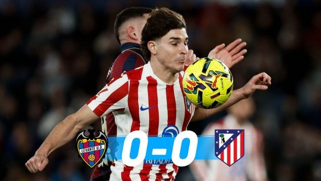Sin contundencia no se va muy lejos. Al Atlético le alcanzó para sacar un exiguo punto ante un Levante que camina falto de oxígeno en esta Liga y con entrenador nuevo desde apenas un mes y medio. En ese río revuelto no pescó el Atlético, apenas tuvo cebo. Ni al inicio ni al final. Se volvió a ver a un equipo que no domina los partidos y mucho menos las áreas. Tiembla en la propia y se da de bruces en la rival. Le costó a los de Simeone crear ocasiones, apenas dos cabezazos, uno de Nico y otro de Julián Álvarez.