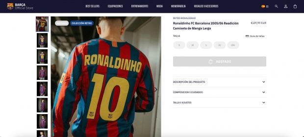 El Barcelona puso a la venta la camiseta retro de Ronaldinho por 129,99 euros y se agotó en pocas horas. Pasadas las 21.00 horas no se podía encontrar en ninguna de las tallas esta elástica que sirvió para homenajear a la estrella brasileña en su 46 cumpleaños. No queda duda de que el Barcelona hizo el agosto con esta promoción que precisamente barata no es.