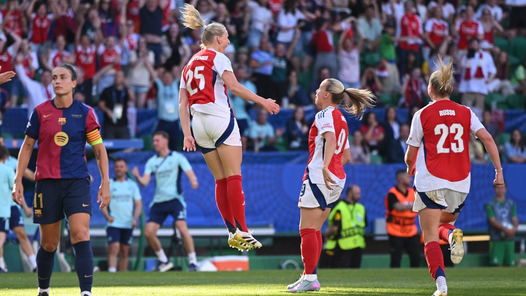 El partido arrancó con presión alta por parte de las inglesas, que intentaban ahogar la salida de balón de las culés y, sobre todo, ponían especial empeño en que el esférico no llegara a Aitana Bonmatí, para que la mejor del mundo no se hiciera con el timón. El Arsenal intentaba robar y llegar con verticalidad, como ocurrió en el minuto 11 con un centro al área pequeña que la australiana Foord remató alto de cabeza.