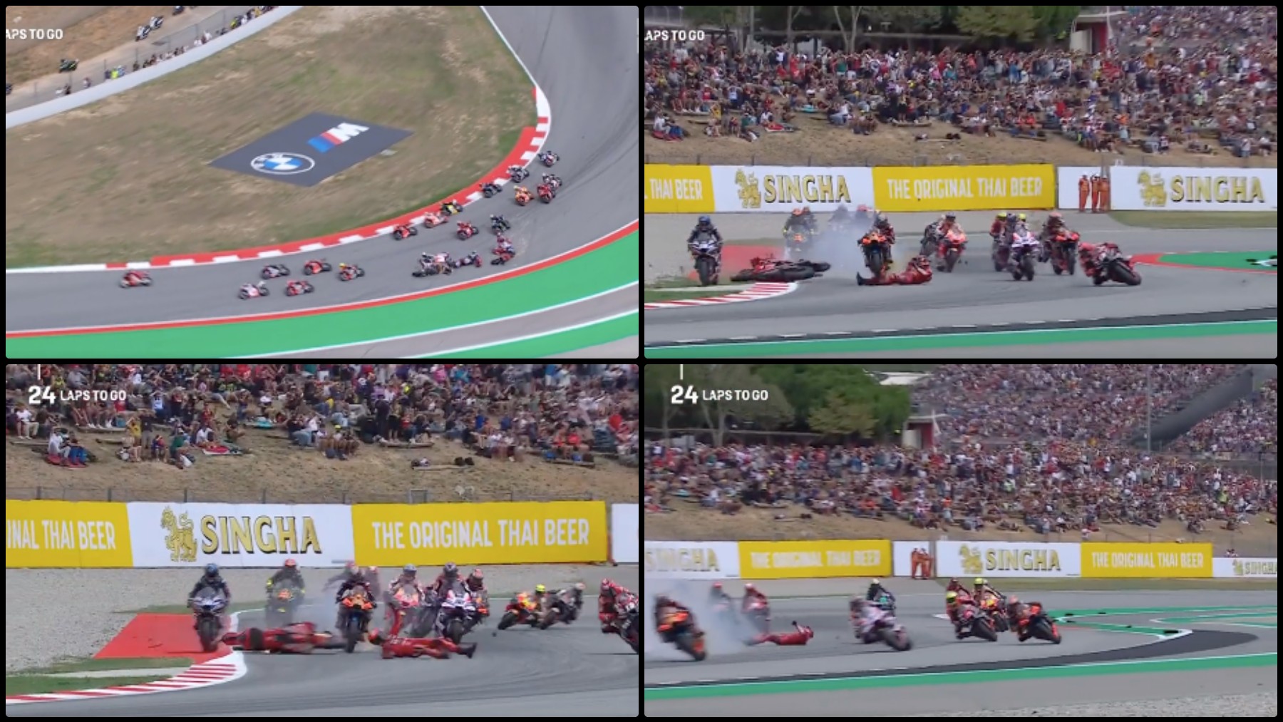 Salida caótica en el GP de Cataluña de MotoGP. Brad Binder pasó por encima de la pierna de Pecco Bagnaia. Todo comenzó en la curva dos cuando Enea Bastianini se metió por dentro, se le fue la moto, tocó a Zarco y de ahí se produjo la carambola donde se cayeron Álex Márquez, Di Giannantonio y Bezzecchi. Unos metros más adelante se cayó Pecco cuando robaba solo. El italiano se quedó tirado en medio de la pista y le pasó la moto de Binder por encima.